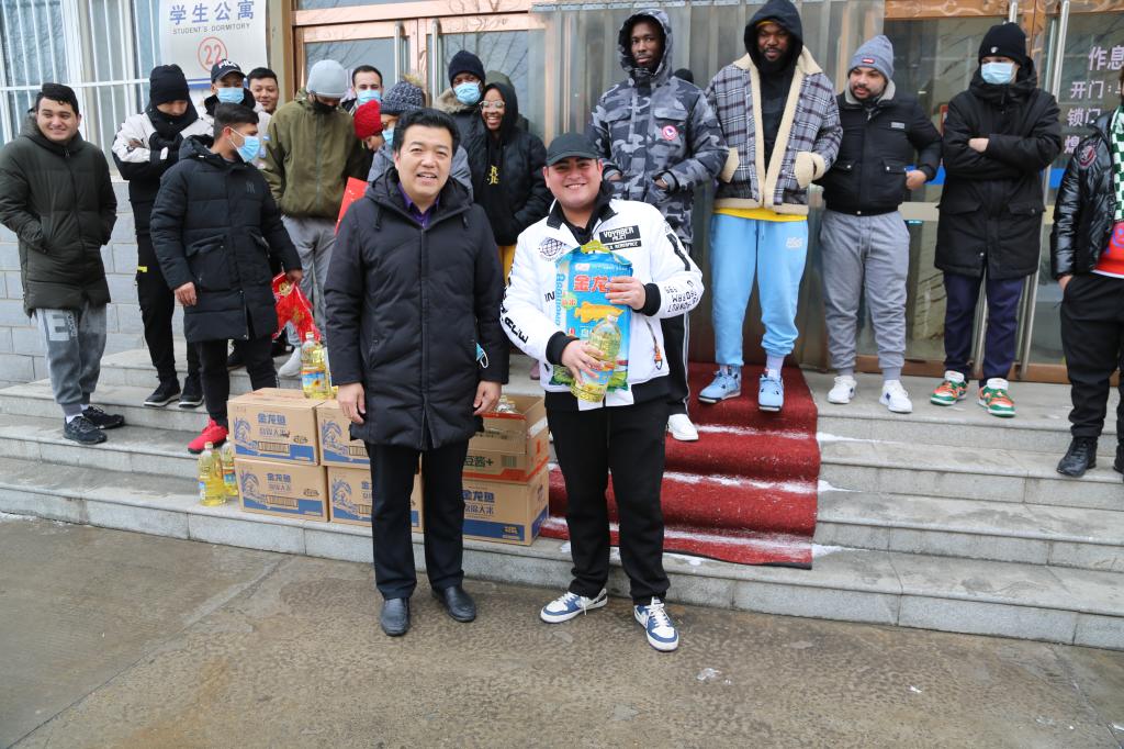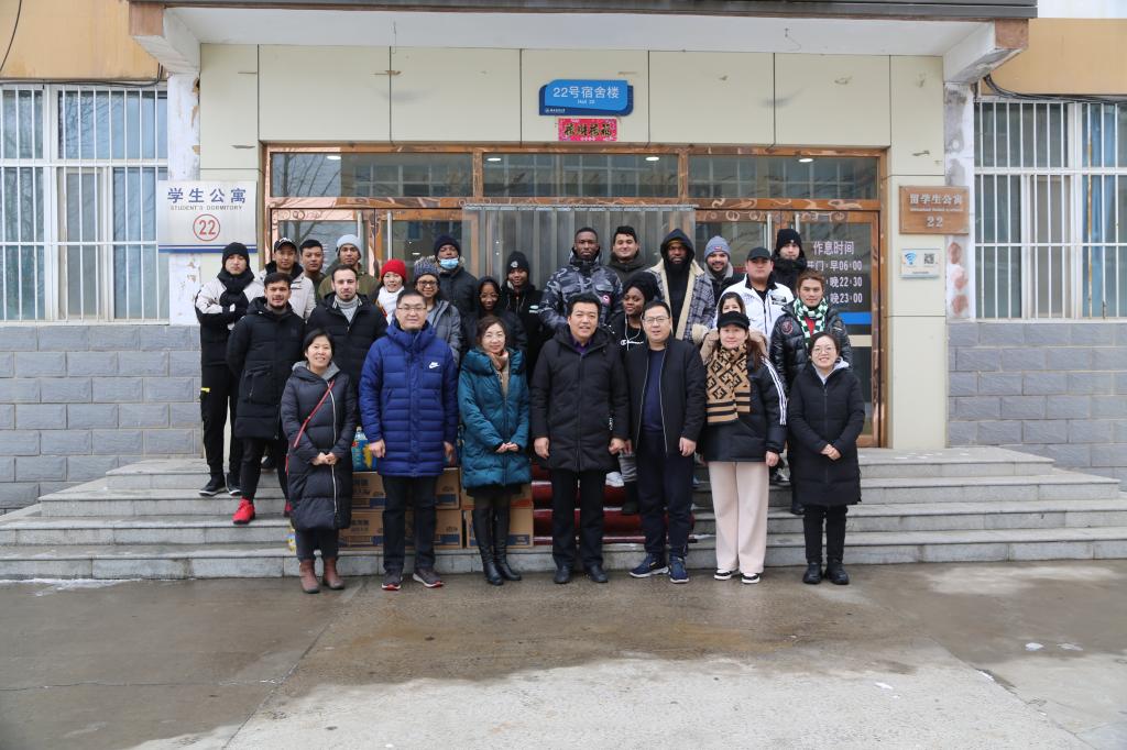领导班子、国际学生辅导员陪同下慰问春节期间留校的国际学生,并为大家送上学校精心准备的新年礼包,代表学校向他们送去亲切的关怀和新春的祝福。