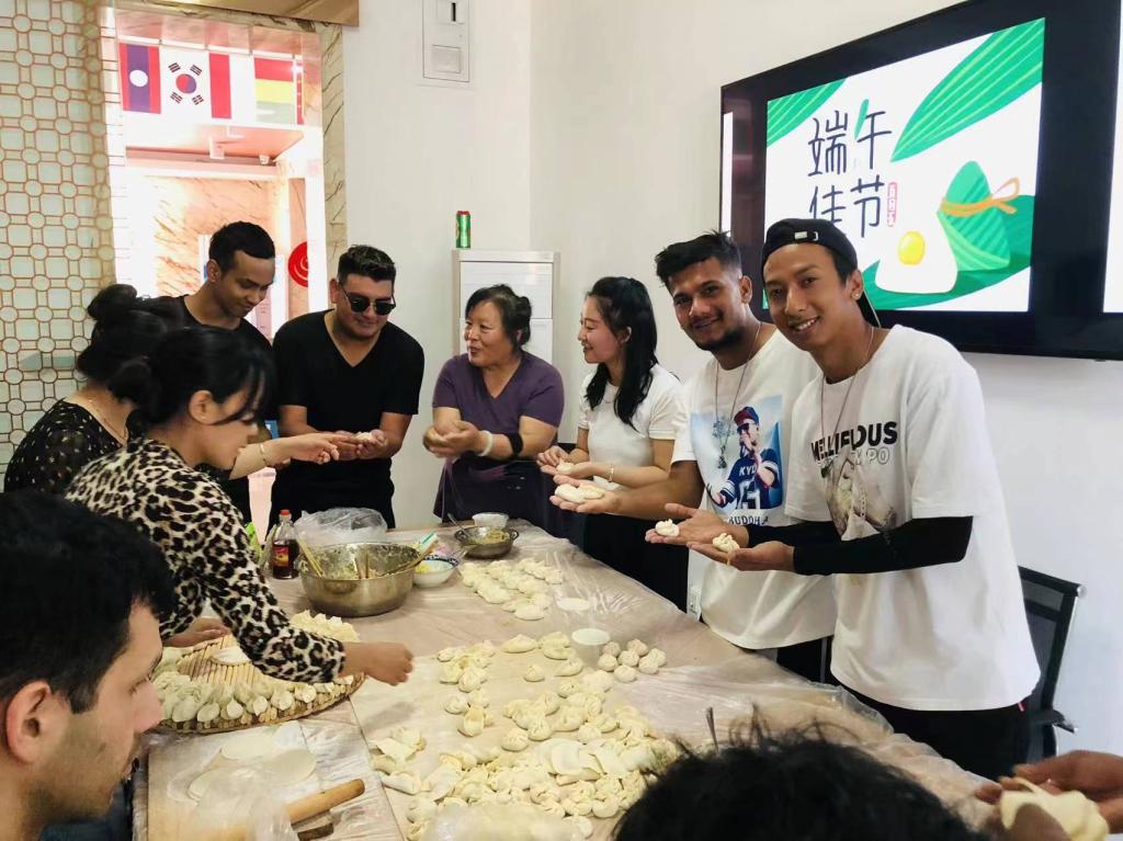 院领导耿辉建、刘晔、赵丽丽、留学生辅导员乔慧、留学生公寓楼管和全体在校留学生共庆端午佳节。