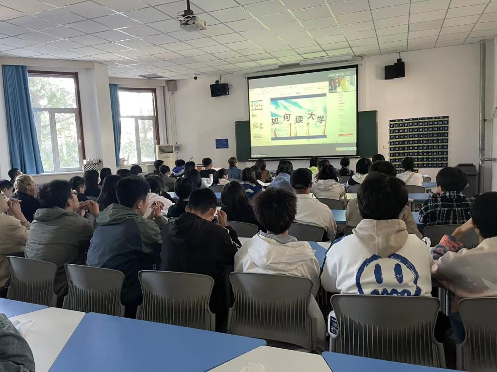 刘晔书记主持课堂,引发同学们对大学生活的畅想。由孟教授就“如何读大学”发表重要讲话。从现代社会激烈的竞争就业压力讲起,孟教授用一个个鲜活的例子,向同学们讲述着“什么是大学”、“怎样才能读好大学”等课题。同时向同学们介绍了经贸优秀学子张梁作为中国第一人完成“14+7+2”壮举的光荣事迹,鼓舞同学们勇攀高峰、砥砺前行。