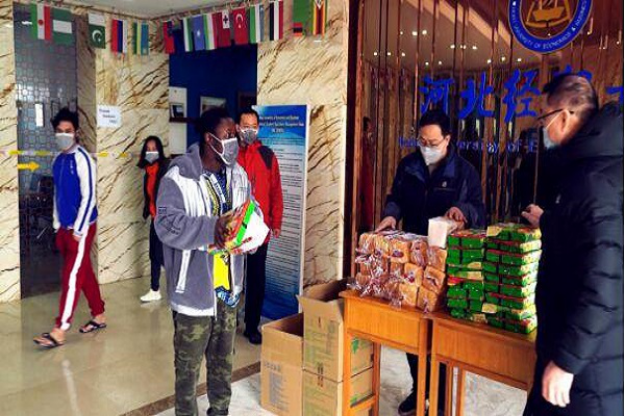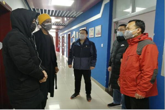 耿辉建、李钢、樊国平、张伟、王倩一行亲切看望留校学生,分发慰问品,他们叮嘱留学生要照顾好自己,做好自身防疫,鼓励他们增强信心,坚信中国一定能战胜疫情。