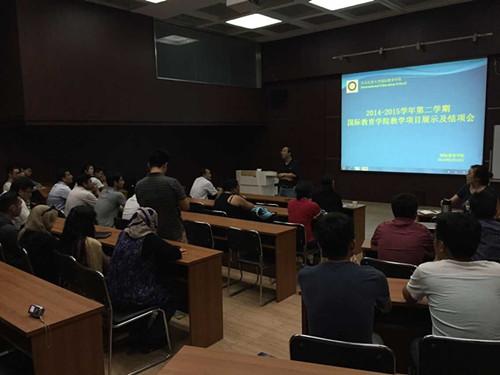 在工商管理学院MBA教室举行2014-2015学年第二学期教学项目展示和结项会议。院长成健、副院长张希颖、项目负责人李钢、刘昕远、王黎燕、全体留学生和部分中国学生参加了此次会议。