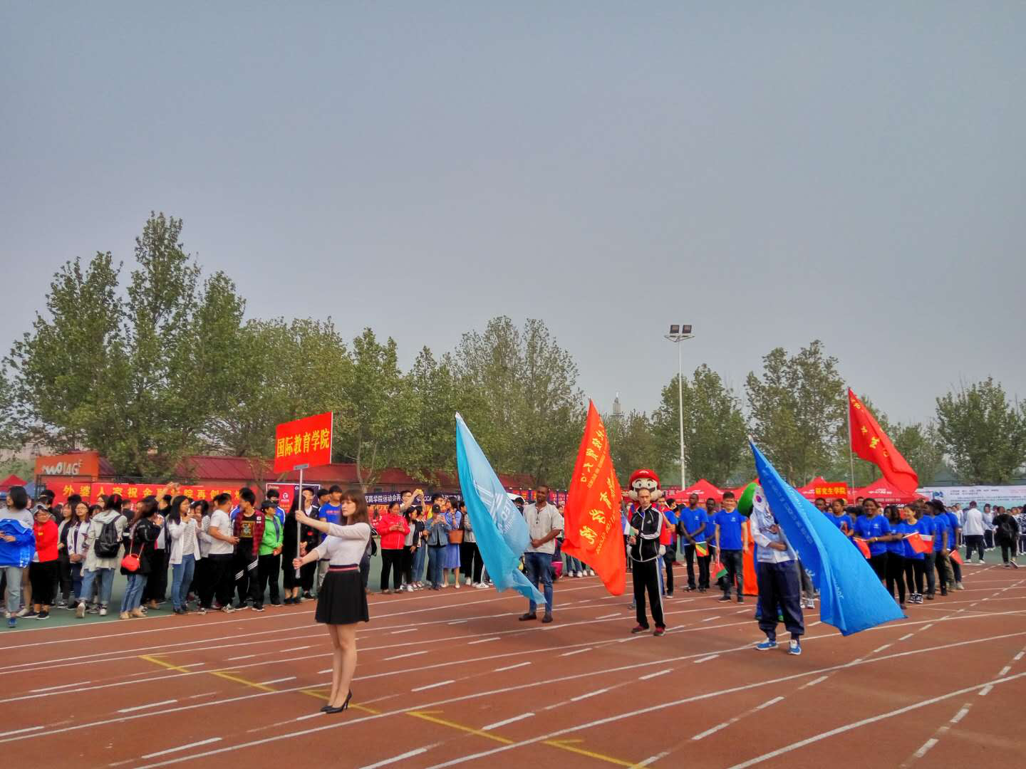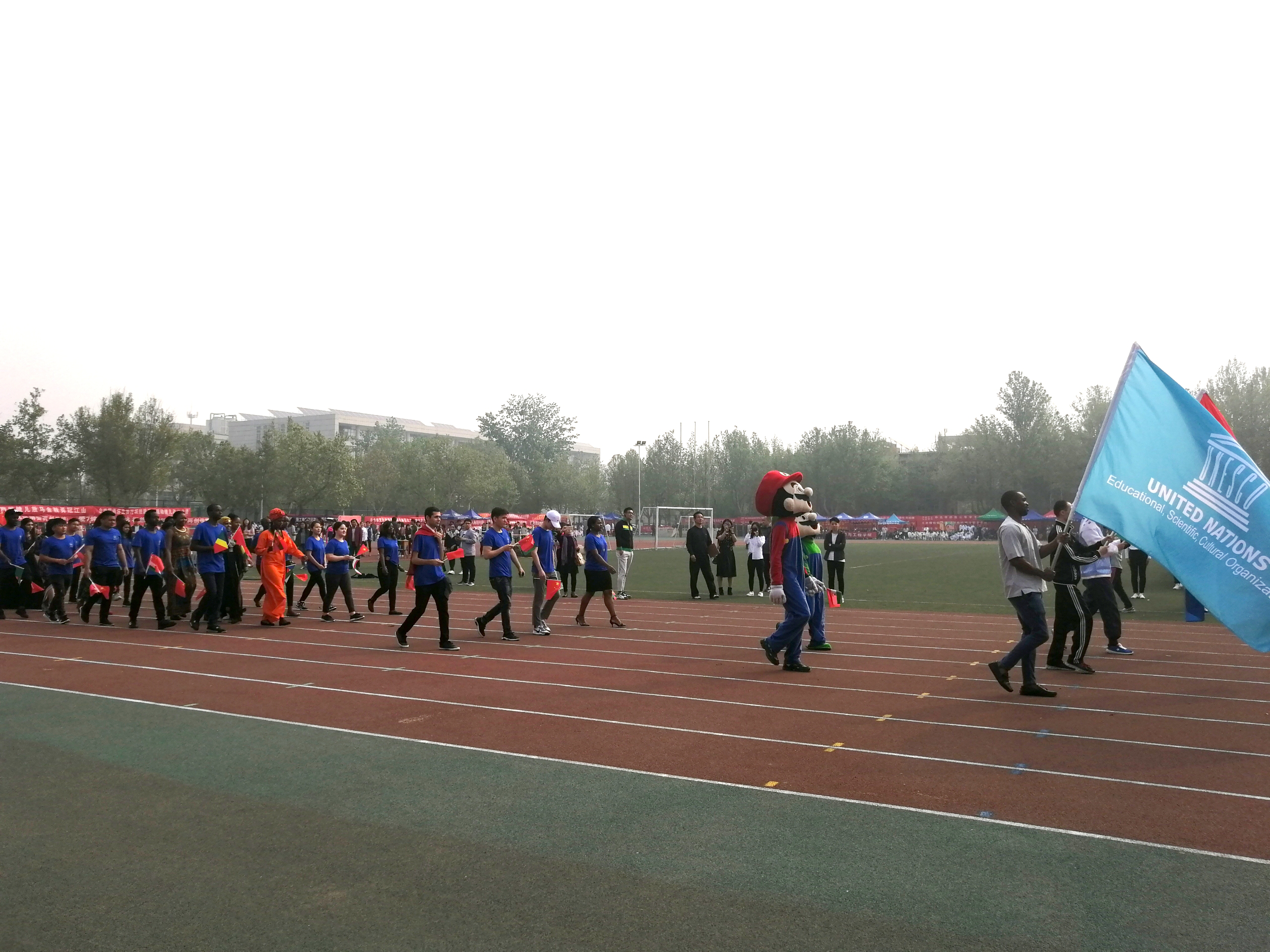 留学生身着蓝色院服,手拿中国国旗和本国国旗,迈着整齐的步伐参加了开幕式。