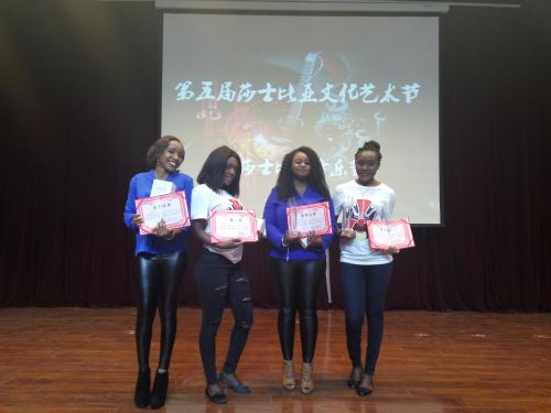 在由艺术学院举办的“百事最强音”歌手海选中,来自赞比亚国的露易丝和孔马娜一展歌喉,深受欢迎,赢得阵阵掌声;5月4日刚刚结束的外国语学院“莎士比亚音乐节”上,来自赤道几内亚的詹妮和白叶梅,以一首西班牙歌曲《Ay Corazon》展现最美和音,获得二等奖;同时,露易丝和孔马娜以一首《Diamonds》,夺得比赛桂冠。