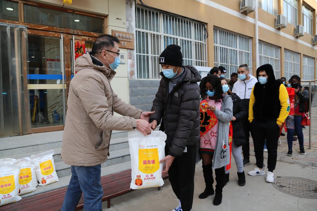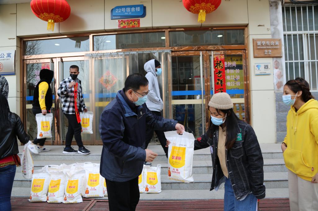 会前,学院员工和留学生在公寓楼挂灯笼、贴春联、送福字,一番热闹景象,留学生公寓处处洋溢着节日的气氛。会后,耿辉建和樊国平为留学生发放生活慰问品,表达学院对留学生战疫情、保平安精神的鼓励和赞扬。此后,院领导和辅导员教师深入留学生宿舍,就消防、用电安全等事项进行重点排查。